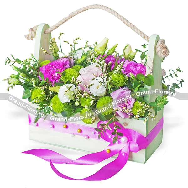 Стандартный: роза розовая - 3 шт., диантус розовый - 3 шт., эустома белая - 1 шт., хризантема кустовая зеленая - 2 шт., декоративная зелень, оазис, деревянное кашпо - 1 шт., декор.